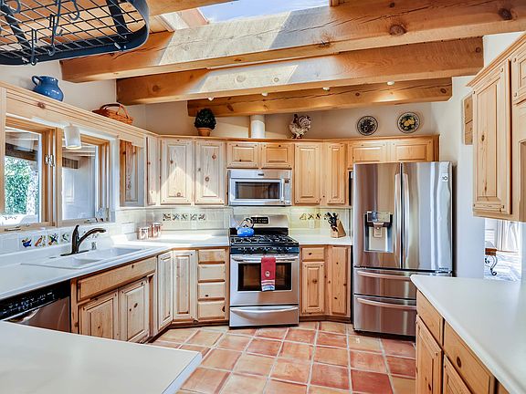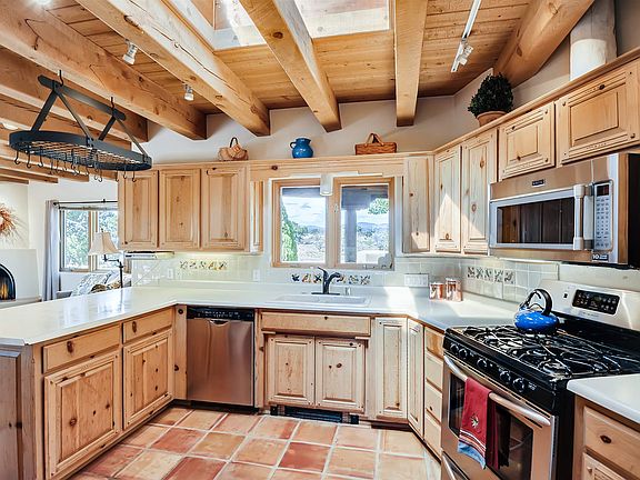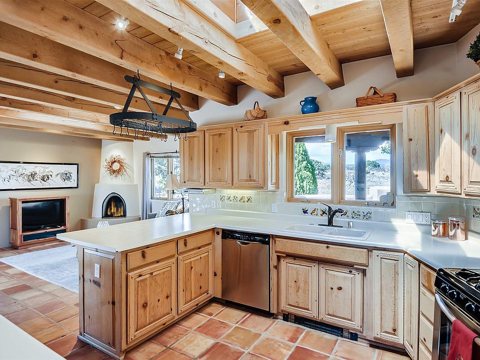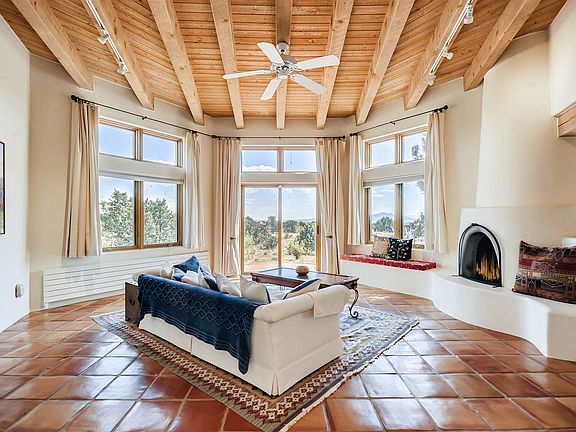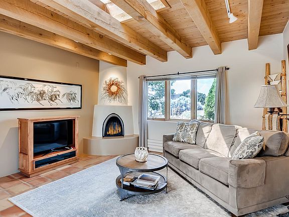 Gorgeous mountain views from this classic in-demand Dressel passive solar home. Happy, light and bright with beautiful Southwestern details and dramatic high ceiling in living area. Wood beamed ceilings in every room, abundant skylights and three wood-burning kiva fireplaces make this home a very special one. Pretty kitchen opens to dining room and lovely den for a second living area. Front and back walled courtyards are fully landscaped and on drip irrigation. The three bedrooms include an owner's suite with walk-in closet, kiva and patio access. A/C split system with refrigerated air in the den adjacent to the kitchen. Very productive peach and pear trees. Proper laundry room with good storage. Attached, direct entry 2-car garage with paved driveway. Hot tub conveys. Beautiful saltillo tile with carpeted bedrooms. NO STEPS. Six months left on roof warranty from Excel Roofing.