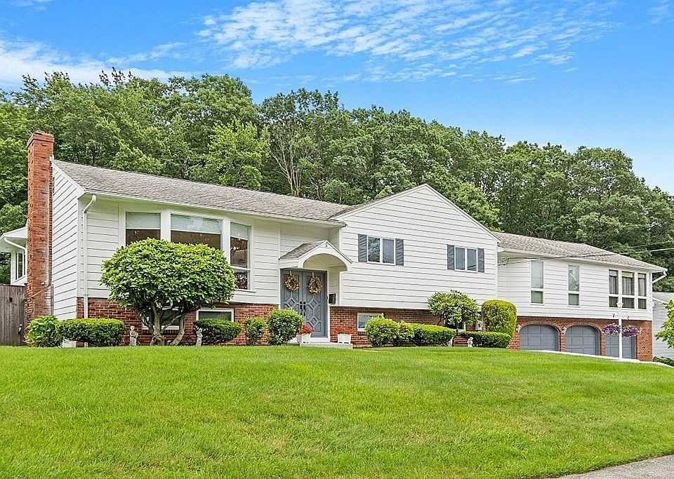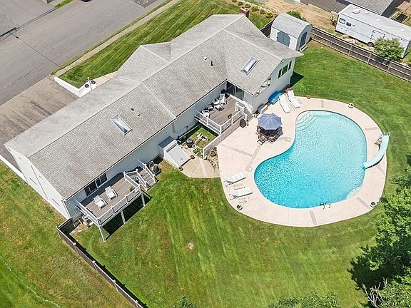 Sprawling split entry in desirable Brooksby Farm area! From the outside in, enjoy the fenced back yard with groomed landscaping, in-ground pool, two composite decks with plenty of yard space for summer enjoyment! Inside, the main level is very spacious with large living room open to the dining room, perfect for holiday gatherings! The kitchen is unique with white cabinetry, casual dining area with cathedral celing and skylights, slider to deck overlooking yard and pool. Two bedrooms, convenient home office "nook" and massive primary suite with walk in cedar closet, large bath with soaking tub and slider to deck. The lower level is expansive with fireplaced family room and game room, potential for extended living with convenient half bath, laundry room and lots of storage! Three car garage with huge paved drive, large shed for storage, fenced yard, central air. So much potential and all in a great location!