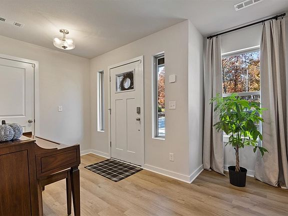 Two-level home on a .40 acre lot at end of cul-de-sac. Serene setting with a covered deck looking into the trees. Spacious cleared yard for green space. Interior features a foyer with large closet, open concept living with a formal dining space & eat-in-kitchen island. Walk-in pantry, stainless appliance, 3cm granite, and full tile backsplash. Vaulted ceilings in the living room. Beautiful drapery highlighting the windows that flood natural light into the home. Stunning main suite on the main level as well as a ½ bath for guests. Two beautiful bedrooms with large closets and a full bath with double sink upstairs.