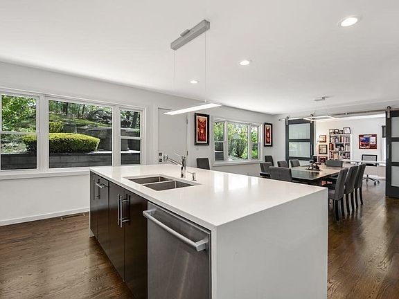 Breathtaking modern Chestnut Hill gem, masterfully transformed by Arco Design and Build, Newton's premier design/build firm! Bathed in natural light and high-end finishes, it boasts an open floorplan for hosting. The kitchen, crafted by HCKitchens, features island w/ quartz waterfall countertops and sleek European cabinets. Central living areas shine with gleaming hardwoods and a 3-sided gas fireplace, complemented by a new half bath. A well-appointed home office with modern sliding doors doubles as a space for overnight guests or gatherings. The primary suite includes dual closets and a beautifully renovated ensuite bath, while two additional bedrooms share another updated bathroom. The walk-out lower level hosts a spacious family room, mudroom, laundry, and second half bath. Extensive hardscaping and a full-length rear patio with built-in seating provides excellent outdoor entertainment space. Conveniently located ~1 mi from The Shops/Rt.9, <2 mi to the train, and <5 mi to Longwood.