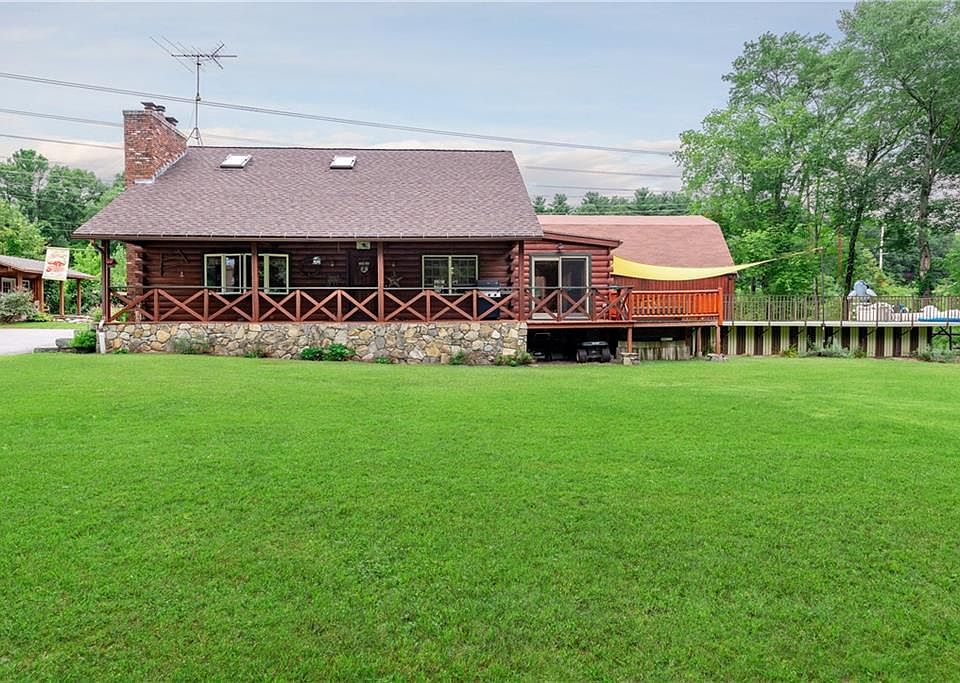 A rare find. Beautiful custom built, one owner house with detached garage/barn located on 3+ acres. This home has all the rustic charm you'd expect in a Log Cabin with all the modern amenities. The focal point of the home is the fireplaced vaulted great room. From its gleaming hardwood floors, to its detailed ceiling, to its stone fireplace, it displays the quality of the home. From the great room one enters the dining room and kitchen. The spacious kitchen has ceramic tile flooring, multiple cabinets and a large peninsula. A 22'x8' all season room overlooks the pool and hot tub. Completing the lower level is a large bedroom and full bath A handmade railing ascends to the second floor master, second bedroom and full bath. Completing the property is a large garage/barn with an expansive loft and an additional storage shed. There are too many details to write down, Call to view this beautiful home.