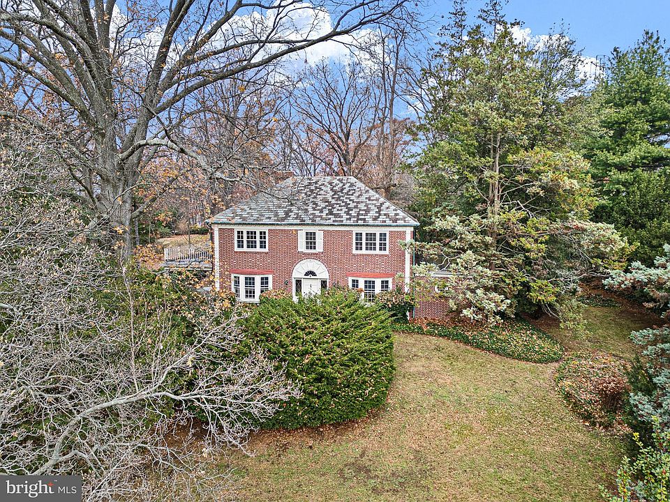 This distinguished brick residence, one of the original model homes in the desirable Edgewood Hills community, sits on a ½-acre plus corner lot. The exterior features refined dentil molding, copper and aluminum gutters, a slate roof, a covered porch, and a two-car garage. A rear patio overlooks a large and private, tree-lined yard suitable for outdoor dining or relaxation. Inside, random-width pegged hardwood floors extend through spacious rooms filled with natural light. The living room includes a stone fireplace and direct access to a covered side porch. Bay windows in both the living and dining rooms enhance the natural light. The retro kitchen offers lots of cabinetry, and opens to a breakfast nook with built-in cabinets, and a Corian-topped eat-in area, plus a conveniently located main-level powder room. A first-floor bedroom or office with an adjoining full bath adds flexibility for guests, work-from-home needs, or multigenerational use. Upstairs, the primary suite includes a tray ceiling, two closets, an en-suite bath, and access to a roof deck. Two additional bedrooms—one also with roof deck access—offer ample storage, including a cedar-lined attic accessible via pull-down stairs. A lower-level recreation area with a glass block bar provides additional living and entertaining space. Recent updates include a newer gas heater and hot water heater (2021). Don't miss this opportunity to make home your own! Home being sold "as is".