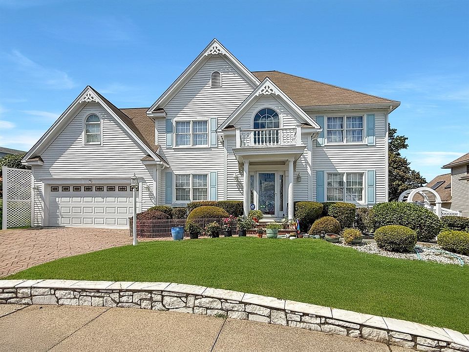 Set high on a double cul-de-sac, this lovingly maintained masterpiece at 5 Blueberry Lane offers three levels of comfort, style, and unique details that make it a truly special place to call home. Enter through a custom glass doorway into a soaring foyer with chandelier and feature windows. The main level boasts a dining room with dimmable chandelier, a French-door office, bright living room with gas fireplace, and a one-of-a-kind kitchen featuring easy-care white cabinets and sparkling Starlight pink Technistone countertops. A charming half-bath completes the level. Upstairs find three bedrooms, full bath, laundry, and a spacious primary suite with wood floors, double-sink vanity, linen closet, and oversized bath. The lower level offers a bedroom, half-bath, closets, and French doors. Outdoors, enjoy a fenced yard with deck, fire pit area, and celebrity-style saltwater pool with waterfall. Updates include new Maytag dishwasher, LG washer/dryer, pool filter, robot, and salt cell.