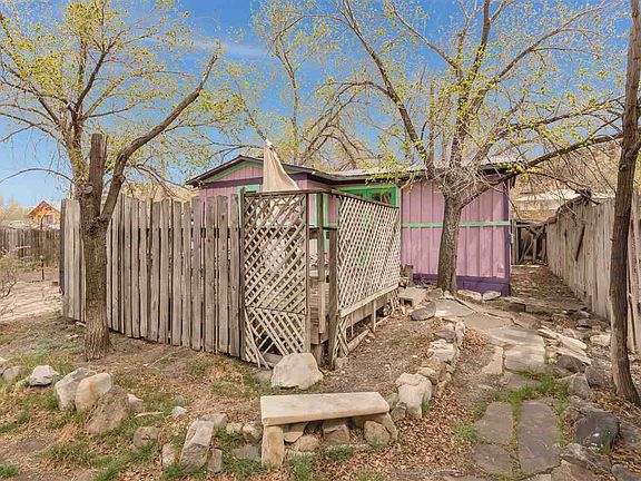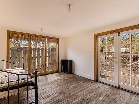 Sweet original miner's cabin with detached studio in the historic village of Madrid, just South of Santa Fe. Located next to the community garden and greenbelt, this home has updated bath, some of the original hardwood flooring, and includes a 12 x 16 detached studio with electric for many versatile uses. With mature trees shading the front deck, the location is private yet just off Madrid Main Street, with walking access to restaurants, galleries and general store as well as hiking paths leading to the Madrid Ballpark and 40-acre County Open Space. Room to expand and lots of parking and all level land. A rare opportunity in this price point. Good rental history and great starter home. One small step from the bedroom to the large bath. Adjoining lot also available.