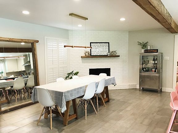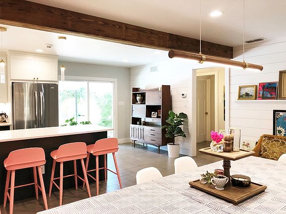 4/2 Completely remodeled in a beautiful, quiet neighborhood. FUN. Entertaining layout for indoors and out. Open kitchen/dining and large den with shiplap walls. Large kitchen island, custom cabinets, and silestone countertops. Custom pendant lighting. Recessed LED lighting. Brand new appliances include range, refrigerator, dishwasher, and washer/dryer. Custom sliding reclaimed barn doors. Master suite downstairs. Upstairs has one full bath and 3 bedrooms. 1 Bedroom upstairs could be additional gameroom/playroom/office. Brick and wood exterior, nice front yard, tree lined drive. Large back patio. Great backyard. Full size pool for Texas summers (and Spring and Fall.!) New 25 year roof. Updated electrical panel and wiring.