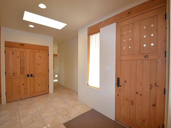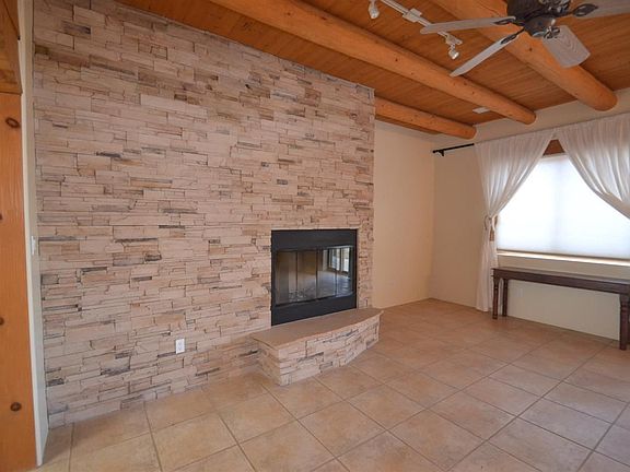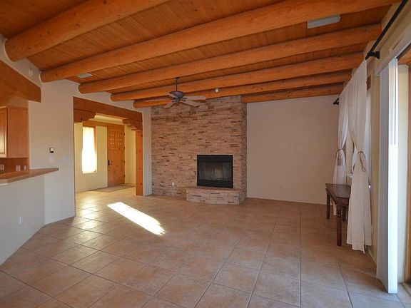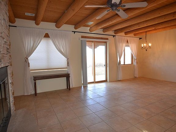 Like new! 2,105 sq. ft, 3 bedroom, 2 bath, 1.86 acres. Formerly a 2nd home, hence pristine condition. Convenient location, easy access to I-25 and nearby Agora Shopping Center. Great year-round indoor climate control via refrigerated air and new radiant heat system. Roof also recently replaced. Home was designed for entertaining with its open-concept kitchen and a media room/studio space which comes fully equipped: Studio lighting and surround sound, just off the main living space. Kitchen has abundant counter space and all new stainless steel appliances. House features an Anasazi stacked wood-burning fireplace. Large en suite Master Bedroom offers jetted tub, walk-in closet AND walk-in glass-enclosed shower. 5 skylights provide abundant natural light, tiled floors throughout, w/ cozy carpeted bedrooms. Over sized 2 car finished garage equipped with ceiling fan and entrance to backyard. New energy efficient custom Levelor blinds ordered and never installed. Outdoor life is important in Santa Fe area homes, and this home offers it in spades, with its covered back portal, fenced back yard and inspiring views out each window!