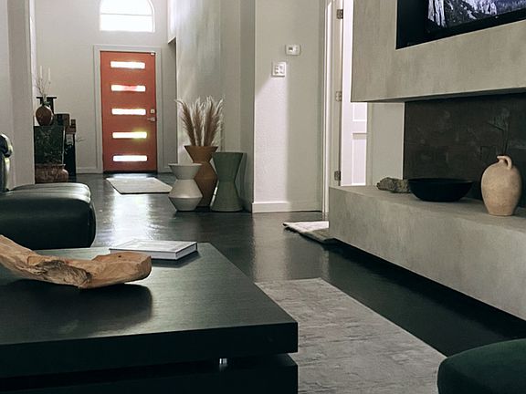 The home features tall ceilings, abundant natural light, and sleek matte-finished, sealed concrete floors throughout perfect for a clean, modern aesthetic and easy maintenance (no carpet!). The gourmet island kitchen is a chef's dream, complete with quartz countertops, super modern cabinetry, and high-end JennAir appliances including an induction cooktop and Hoshizaki ice-maker. Relax by the sleek built-in electric fireplace on a stunning accent wall. Both spacious bedrooms are located downstairs, including the luxurious primary suite with dual walk-in closets featuring Elfa closet systems.