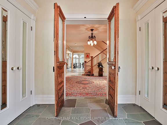 Gated parkingStained glass doorsHigh ceilingsPrivate ravine