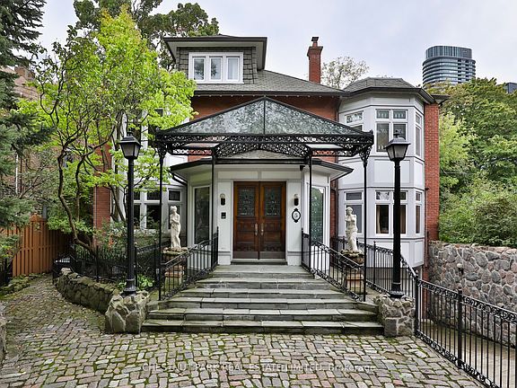 One of a kind old world European vibe. Over 7,000 square feet of incredible character filled space with 7 car gated parking. A unique blend of Ralph Lauren mixed with Wyoming Cabbagetown, Riverdale, the Annex and Rosedale. 4 gas fireplaces on main imported from Europe, 9 foot stained glass doors. Columns, pillars, high ceilings, 6 bedrooms, 6 bathrooms, an incredible chef's kitchen with aga stove and barbeque. Island warming ovens. Tranquil private ravine 245 ft in back with 2 tiered decks. Double car built-in garage.