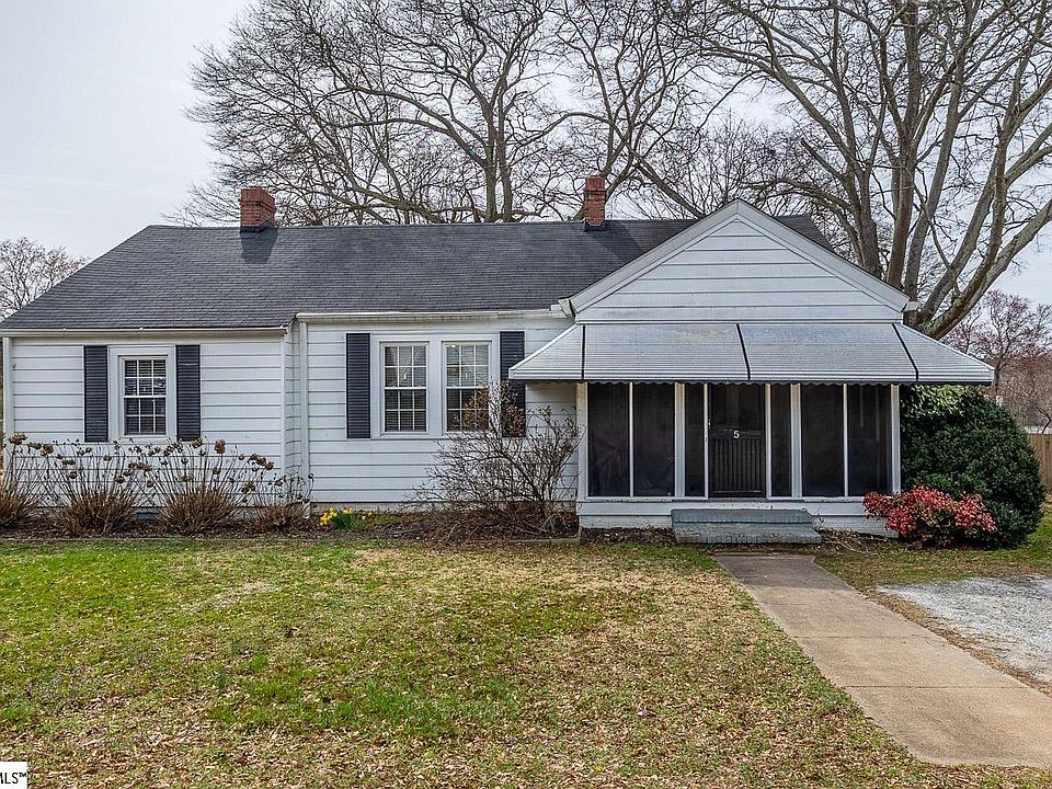 Welcome to 5 Center Street, this 3 bed, 1 bathroom residence is poised in a highly convenient locale merely 5 minutes from Taylors Mill, renowned for its vibrant array of local attractions including 13 Stripes Brewery, The Farehouse, and Pinky's Revenge Arcade. Also positioned just a mile from Wade Hampton Boulevard, esteemed for its plethora of shopping destinations such as Target, Hobby Lobby, Lowe's, Home Depot, and more, this property offers unparalleled accessibility to everyday amenities. Upon entry, the front screened porch provides a serene retreat, ideal for unwinding and embracing the outdoors, while the fenced backyard offers additional privacy and relaxation opportunities on the spacious patio as well as covered parking next to the shed. Stepping into the home reveals a generously proportioned living area and an adjacent large bedroom. The residence further comprises a master bedroom boasting dual closets, alongside a third bedroom conveniently situated adjacent to the shared full bathroom. The residence's functional layout extends to the kitchen featuring a sizable double bowl sink and a convenient closet-style pantry, ensuring ample storage space for culinary essentials. Adjacent to the kitchen, a walk-in laundry room, replete with multiple cabinets, serves as both a utility space and an additional storage area. Outdoor enthusiasts will appreciate the fenced backyard, complete with an AS-IS outbuilding providing supplemental storage solutions, and a sprawling yard, perfect for recreational activities or cherished moments with loved ones, including furry companions. Schedule your showing TODAY!