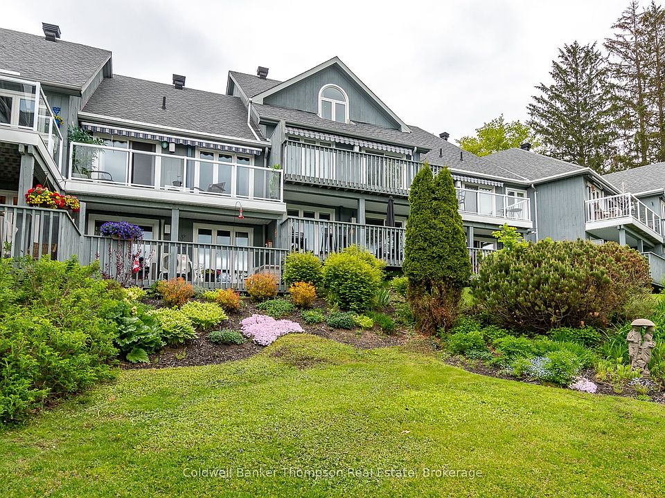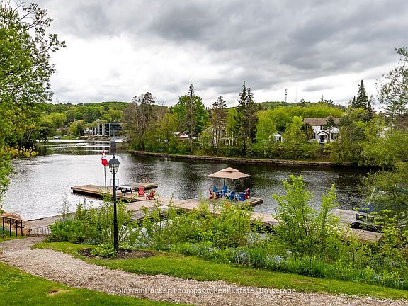 Enjoy the ease and comfort of condo living in this beautifully updated 1-bedroom, 1-bathroom main floor unit perfectly suited for empty nesters, downsizers, or investors looking for an exceptional Muskoka property. Step inside to an open-concept layout filled with warmth and light, thanks to the southwest exposure that brings in the afternoon sun. The recently renovated kitchen is stylish and functional, featuring quartz countertops, a matching backsplash, and stainless steel appliances under two years old. The living and dining areas flow seamlessly to a spacious private balcony, offering the ideal spot to unwind or entertain outdoors. The bathroom has been tastefully upgraded with a modern step-in tile and glass shower, and the unit also includes a generous storage locker for added convenience. Situated in an adult-only building, residents enjoy low-maintenance living with the added perk of a welcoming sense of community. What truly sets this property apart is its rare waterfront access and prime downtown location. Just steps from your door, a beautiful shared waterfront on the Muskoka River awaits, complete with a communal dock and boat slips giving you access to over 40 miles of boating through the stunning Huntsville lake and river system. Whether you're heading out for a paddle, a day on the boat, or simply enjoying the views, this is waterfront living at its finest. Add in a community BBQ area and the ability to walk to downtown Huntsville's vibrant restaurants, cafés, shops, and year-round events, and you quickly see why this property offers the best of both worlds: the serenity of waterfront life combined with the energy and convenience of a thriving town center.
