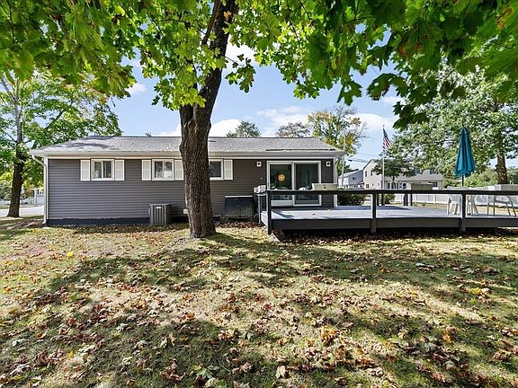 Newer roofSunny oversized deckCorner lotBackyard havenNewer maintenance-free vinyl sidingCrisp white cabinetrySoaring beamed ceiling