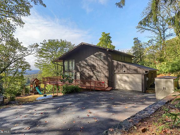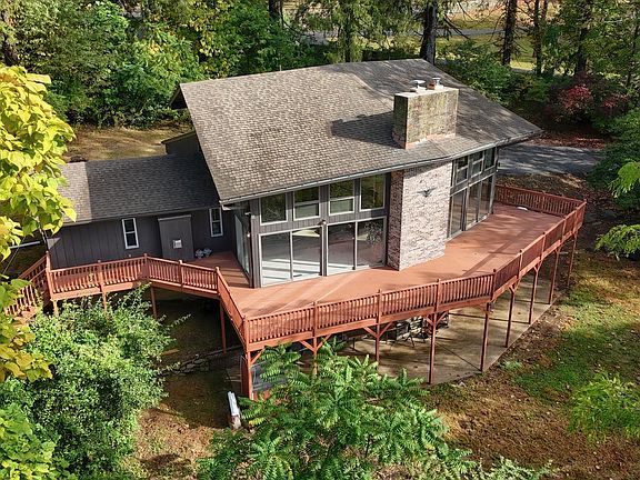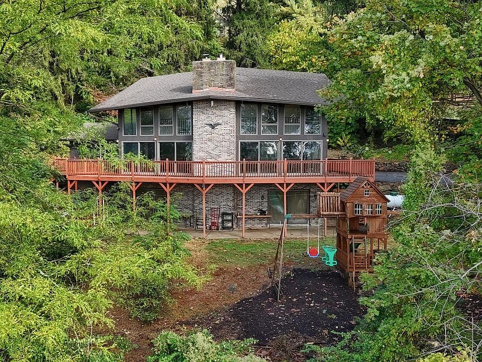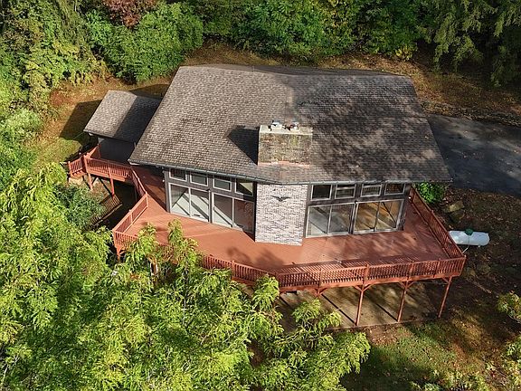 Enjoy the absolutely stunning views of your home while sitting on your wrap around deck overlooking the neighboring golf course and town ahead, on a private, secluded 2 plus acre lot. The main level features high ceilings with exceptional natural lighting along with a stone fireplace. This home boasts a one of a kind, unique Primary bedroom! The Primary bedroom has a fireplace, custom made windows, hardwood flooring, three closets and an office / suite area. It also features two full bathrooms. The upper level features a nice view overlooking the main level as you walk from room to room. Each additional bedroom features built in drawers. Furthermore, there is a fully finished and carpeted walkout basement with a wood burning fireplace. The basement features another full bathroom, laundry room and three additional nice sized closets. In addition, there is plenty of private parking, featuring a garage and ample driveway space. Schedule your showing today, you won't be disappointed!