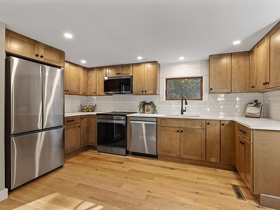 Nestled on a quiet cul-de-sac, this EXTENSIVELY RENOVATED home offers 3 beds, 2.5 baths, and a large/detached 2-car garage. Perfectly situated across from scenic March’s Pond, the property blends New England charm with modern upgrades. Step inside to a stunning new kitchen featuring all new cabinetry, quartz counters, Samsung appliances, and a coffee bar—ideal for morning routines or entertaining. The dining room flows seamlessly into a welcoming living room with a cozy woodstove, creating the perfect space for gatherings. The first-floor primary suite is wrapped in windows and features a stunning vaulted ceiling clad in warm pine planks! The suite offers a brand-new bath with a spectacular custom tiled shower, double vanity and designer mirrors, lights and hardware, along with a large closet and laundry hookups! Upstairs you'll find two spacious bedrooms and a full bathroom. The finished lower level adds flexible space for a rec room, home office or playroom, along with an additional laundry room and additional room for storage or further expansion. Additional highlights include a brand-new roof, new electric/plumbing, new flooring, Trex deck, freshly painted siding, new garage doors, and a brand- HVAC system with central air for year-round comfort! Enjoy access to March's Pond, while still being close to area lakes, trails, and commuter routes to the Seacoast, Lakes Region, and Concord. With its thoughtful renovations and prime location, this home is truly move-in ready.