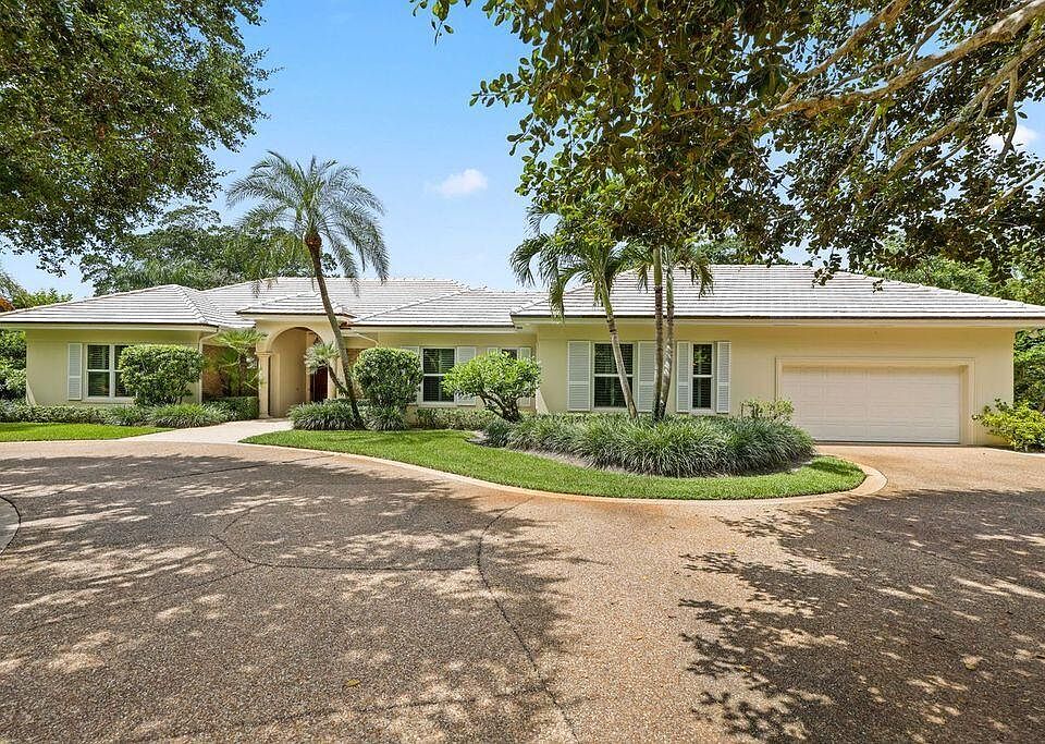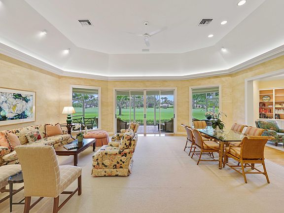 Elegantly situated in the prestigious Village of Golf, 5 Country Road East A is a gracious single-family residence offering timeless style and serene golf course views. Built in 1996 and thoughtfully maintained, the home encompasses 4,131 total square feet with 3,198 square feet under air on a beautifully landscaped 0.82-acre lot. The classic, traditional design welcomes you with a formal entry leading into a grand living room featuring soaring ceilings and walls of glass that frame the tranquil fairway setting. Ideal for entertaining, the living space flows seamlessly to an enclosed lanai, perfect for year-round enjoyment. Inside, rich hardwood floors, custom built-ins, and a warm family room off the kitchen create an inviting atmosphere. The chef's kitchen is appointed with a large kitchen island, granite countertops, premium appliances, and an oversized pantry. The spacious primary suite offers high ceilings, abundant closets, and a luxurious bath with dual vanities, soaking tub, and separate shower. An attached office provides the perfect private retreat. Two large guest suites, each with walk-in closets and ensuite baths, complete the split-bedroom plan.