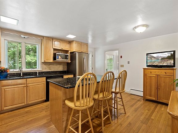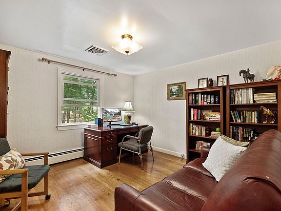 Tucked on a quiet cul-de-sac near schools and downtown, this spacious 3bedroom, 2.5 bath split level offers comfort and flexibility. The upper level features hardwood floors, a primary ensuite, and a granite kitchen with warm wood cabinetry, center island, and eat-in space that flows into the dining room with built-ins, open to the fireplaced living room. A three season sunroom overlooks the private yard, gardens and conservation land. The lower level includes a second fireplaced living area and a large tile floored bonus room ideal for a gym, playroom, or office. A separate laundry room and access to the backyard and covered, enclosed patio. Walking paths surround the home, and a two-car garage with a large tool room adds convenience.