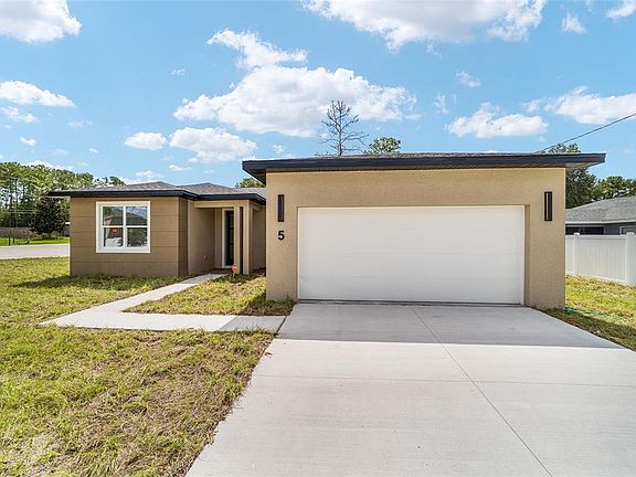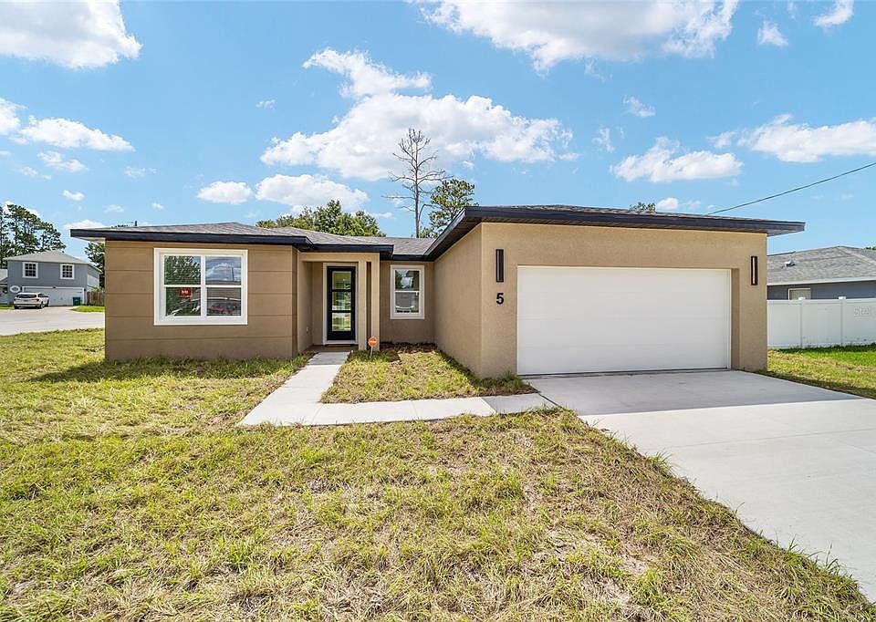 Welcome to this stunning newly built home, ideally situated on a desirable corner lot on a cul-de-sac in the heart of Silver Springs Shores. Combining timeless design with modern elegance, this home is built to impress from the moment you arrive. Step through the covered foyer into an open-concept floorplan featuring luxury vinyl flooring throughout, a formal dining room with textured shiplap accent walls, and a tray ceiling. The sleek island kitchen is a chef’s dream—complete with stainless steel appliances, quartz countertops, and a spacious walk-in pantry. The luxurious primary suite is thoughtfully designed with a custom barn door entry leading into an oversized bathroom. Enjoy dual vanities, a massive walk-in shower with classic subway tile, and expansive walk-in closets. Perfect for entertaining, the open patio offers an ideal space for weekend gatherings or relaxing weeknight dinners under the stars. Located in central Silver Springs Shores, you're just minutes from shopping, dining, and medical facilities. Don’t miss this rare opportunity to own a brand-new home in a prime location!