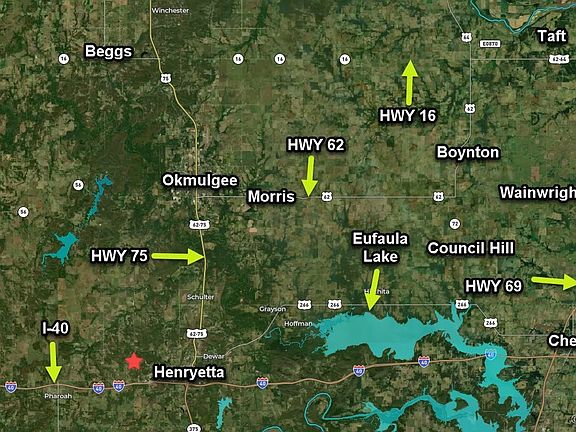 5 +/- ACRES IN HENRYETTA—LESS THAN 2 MILES FROM I-40 AND ONLY 13 MILES TO EUFAULA LAKE. Situated in the gorgeous countryside of Henryetta halfway between Tulsa and OKC, this amazing 5 +/- acre property is the perfect place to lay down roots and start a family in an excellent community! The large, mature trees provide plenty of privacy, making this property even better for a future home site. Whether you envision a peaceful escape or a place to create lasting memories with family and friends, this land invites you to discover the perfect balance between rural solitude and urban convenience. With I-40 less than 2 miles away, HWY 75 just 4 miles away, and both HWY99 and US-69 less than 30 miles away, the property is conveniently located between Tulsa and OKC, ensuring seamless access to the cultural hot spots of Tulsa and OKC. Embark on scenic drives through majestic Oklahoma countryside as you visit the numerous local landmarks that showcase the state’s rich history and heritage. Nature enthusiasts will appreciate that it’s only 13 miles to Eufaula Lake and its beautiful setting full of outdoor adventure and activities. Don’t miss your chance to capitalize on this amazing opportunity. Additional land available. Contact us today to schedule a showing. Buyers agents welcome!
