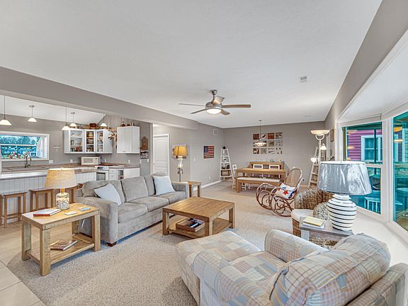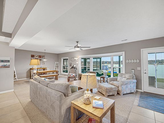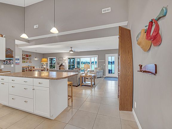 Santa says Welcome Home to this lakefront property that sits on the perfect point of the island!! Inside you will enjoy this immaculate and well-maintained home featuring a large open concept on the main floor includes dining, living room and kitchen. You will notice there is no TV in the living room because you will be too busy watching all the views from the large bay window. Sellers have updated the home, including the kitchen with new appliances and washer and dryer which remain with the home. You can eat in the kitchen or dining room or even on the screened in porch while watching the sunset.Second floor features 2 bedrooms and an open area currently used as a TV room, there is also a bath with a skylight! Also sellers have installed a stairway installed leading to the lake, garage, and/or sandy beach area. Enjoy water sports, swim platform, lift, shore station and pier, which all remain with the home. Tracker boat can be sold separately.