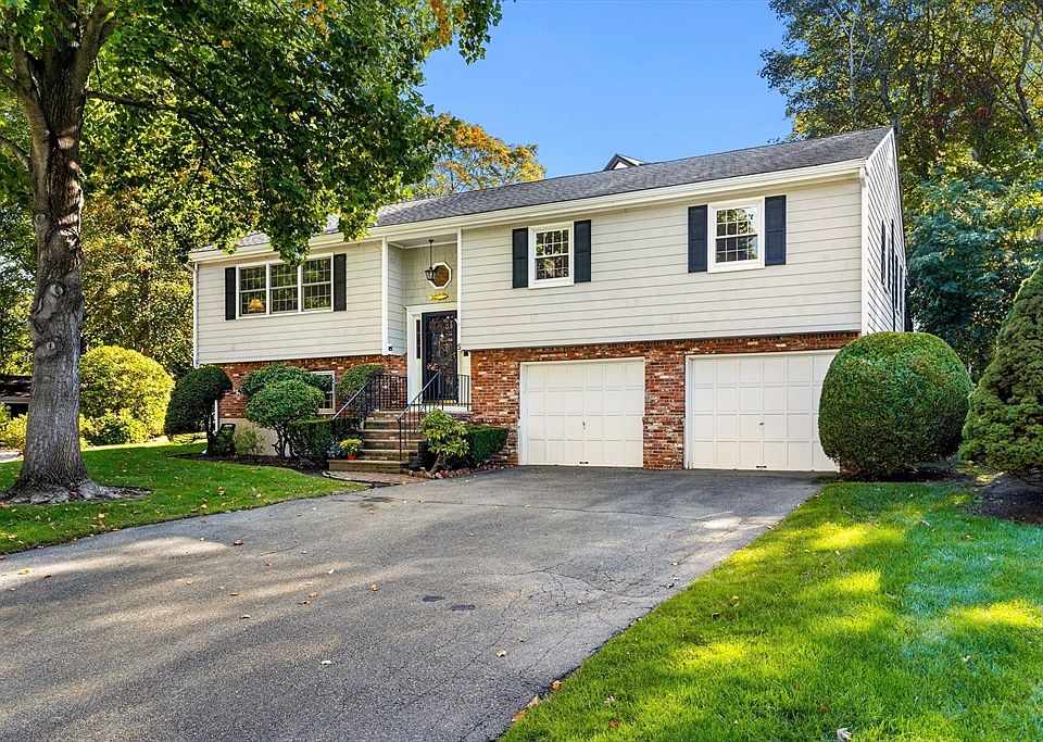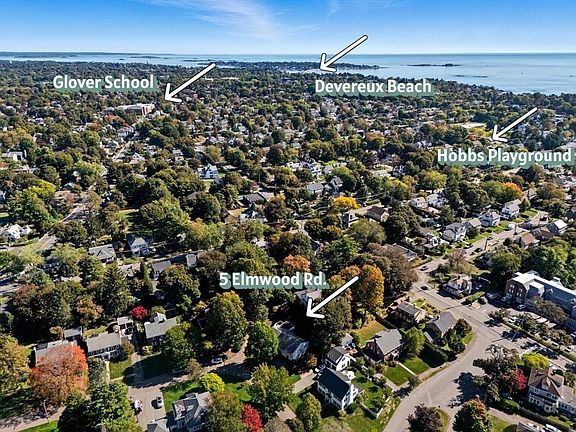 Welcome to 5 Elmwood! This light-filled, split-entrance home has an abundance of charm and useful space. The front entrance leads to two small stair cases, one up to the living room and the other down to the lower level. The expansive living room offers a large picture window with a bird's eye view of the street, gas FP, cathedral ceiling and hardwood floors. Dining Room is off of the living room and kitchen and includes bay window and vaulted ceiling. The eat-in kitchen with granite counters leads to a solarium-like den/tv room with access to an 12 x 18 back deck, patio and large yard. Perfect set-up for entertaining. Finished basement for office and family room with cedar closet, systems, and 1/2 bath on this level. Multiple skylights, oversized 2-car garage with direct access to interior, backyard shed, central air, newer windows, irrigation system, mature plants, and 2023 heating system included! Close proximity to Vinnin Square, Glover School, Hobbs Playground and Preston Beach!