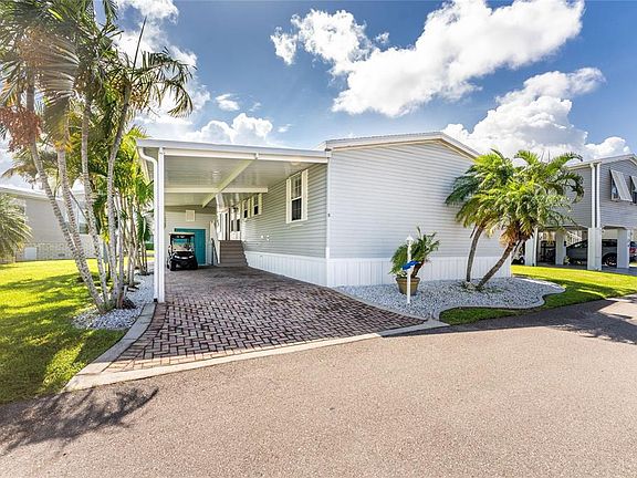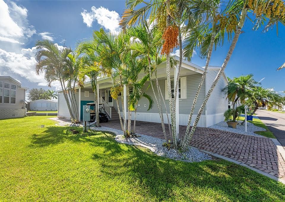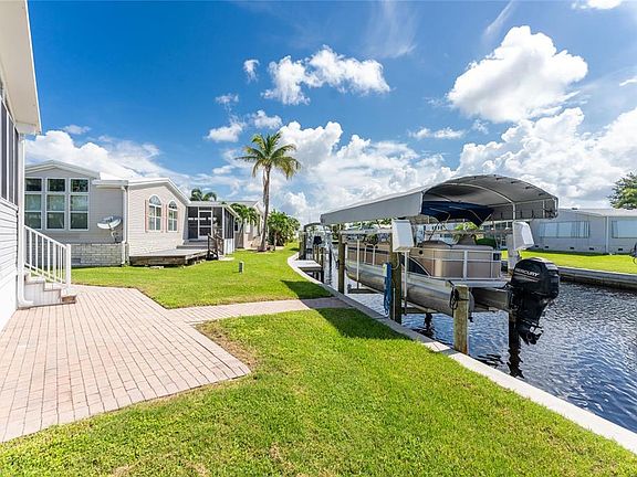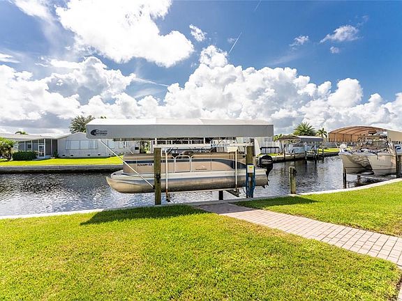 EXCELLENT WATERFRONT VALUE! GULF ACCESS HOME, just 20 minutes to the Harbor via Alligator Creek. No bridges to the Harbor. This charming home includes attractive, quality furnishings, has a newer roof and carport (2023), has an open floorplan and appealing updates. The Florida room overlooks the water and your covered boat lift that has newer pilings and electrical. A handsome brick driveway leads to the double-door shed/workshop with room to store all the tools and toys. The brick path continues to the back of the home where you'll find a sunning patio and your waterfront amenities. Perfect location close to the pool and clubhouse. Windmill Village is a resident-owned community with a saltwater marina, boating club, kayaking club, bocce ball, horseshoes and much more. The upscale clubhouse includes a library, billiards room and grand hall for dinners, dances and events. A resort sized heated pool is perfect for laps, water aerobics or lounging with friends. Sell the lawn mower, grab the fishing gear and head down to your tropical retreat! A monthly fee of $260 covers lawn mowing, water & sewer, recreation facilities and management. A $20k share buy-in is required at purchase and is returned when you sell. Windmill Village offers a wonderful lifestyle just minutes to downtown Punta Gorda waterfront and restaurants. Note - artwork does not convey.