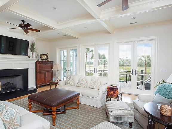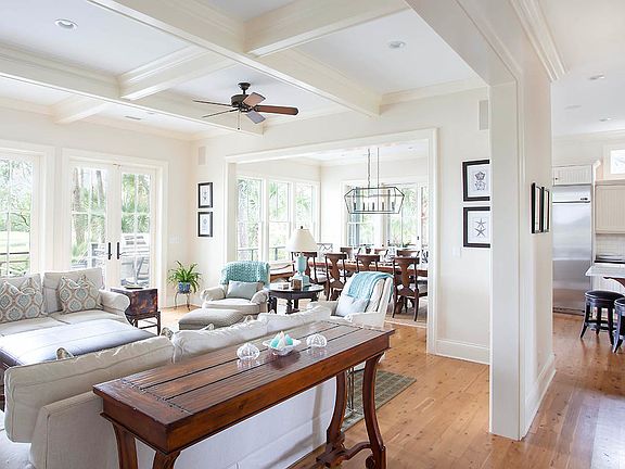Step inside, and you'll find an elegantly furnished haven where the bright interior harmonizes with the natural beauty that surrounds it. The living room becomes a sanctuary with its focal point being the marsh view visible through three sets of French doors leading to expansive outdoor living spaces, offering over 1,400 square feet of decks and porches along with a refreshing pool. Whether it's the ocean breezes in summer or the protective warmth in winter, the outdoors beckon. Architectural details such as a coffered ceiling and fireplace add a touch of thoughtful sophistication.