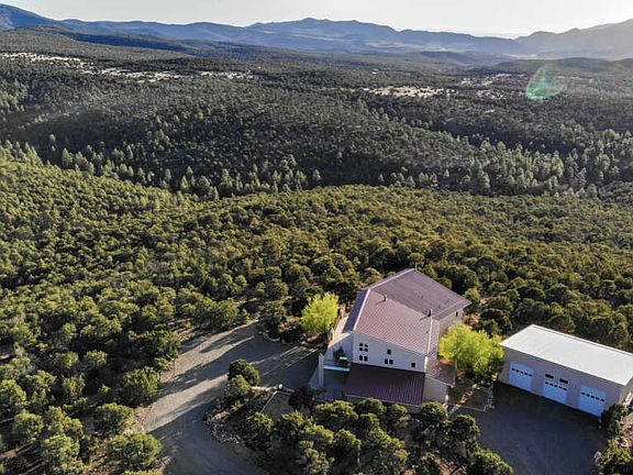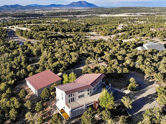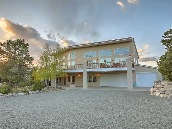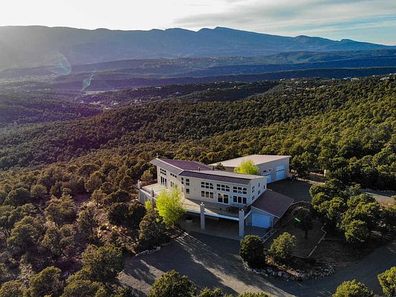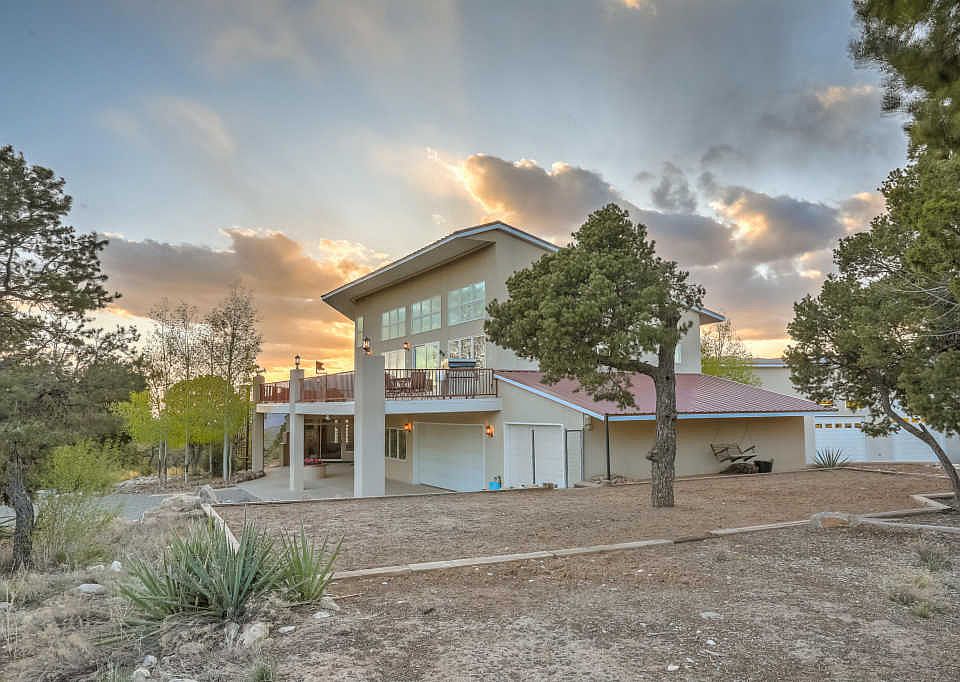 Welcome to this finely crafted custom home sitting on 8.6 acres within the Nature Pointe gated community. Located adjacent to the beautiful Cibola National Forest, providing privacy, easy access to endless miles of forest hiking trails, and East Mountain living at its finest. This unique 2-story design is timeless and maximizes the views and natural light with many picture windows. This design provides the benefits of single story living. Upstairs you will find an expansive recreation deck with stunning panoramic views of Sandia and Manzano Mountains. The kitchen/dining/gathering room is very open and offers great natural light. Each bedroom offers large custom walk-in closets. Custom cabinets throughout provides vast storage space.