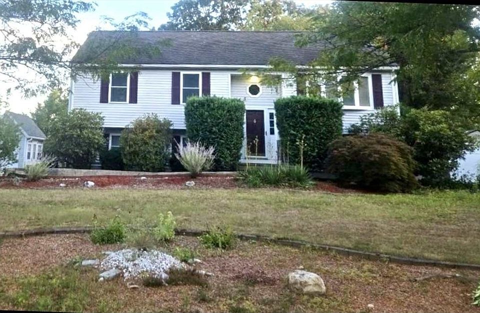 Lovely split-level home will make your heart sing. Pretty stone fireplace Clean & fresh with track lighting, cathedral ceiling, new light fixtures, & open concept. Features newly painted walls & stained floors, fresh plush carpet, siding, shutters, storm doors, sliders to deck w/ Aztec boards & Trex rails, newer roof, Harvey windows, bow window, sheetrock, appliances (stainless steel). All the work has been done for you. With central air, an attic fan, & some programable lighting, what more could you ask for? Move right in. Fenced in yard with beautiful split-level gardens. 8x10 Shed features loft, double doors, and ample space for storage, built local from Baystate Structures. With a full finished basement with a bar for entertaining, separate laundry room, and plumbed for a bathroom. A 2-car garage under the home leads to the basement for easy access. Beautiful white paint & neutral colors, just decorate and relax. Stone wall frames garden plus home has full brick chimney.