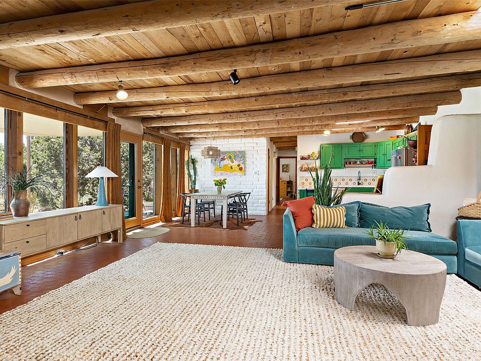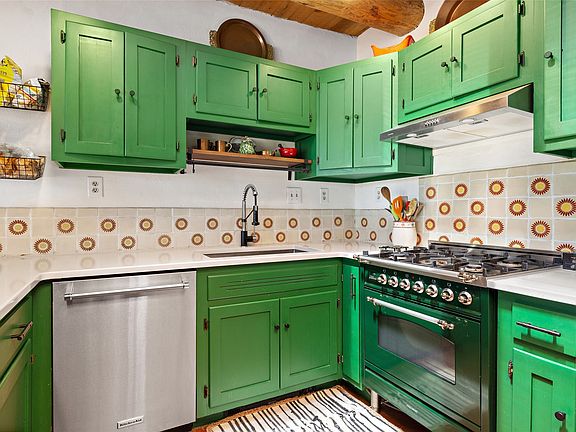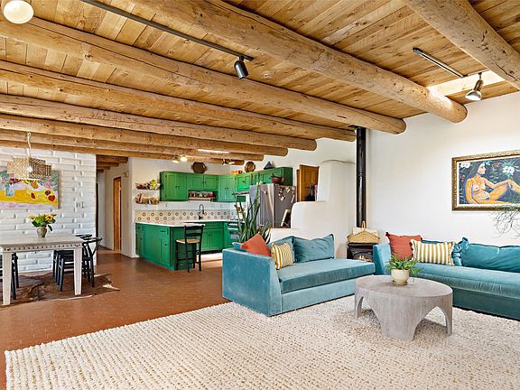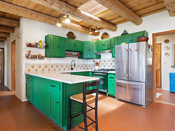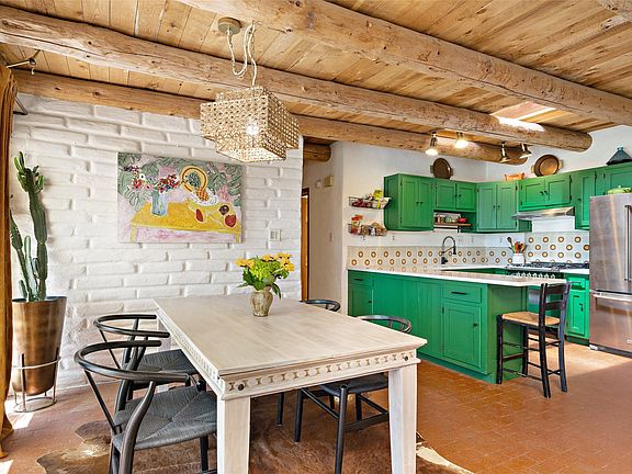 VERY SWEET, REAL ADOBE Eldorado passive solar. Charming completely redone kitchen with quartz countertops, backsplash and new stainless appliances. Kitchen opens to dining and living areas. Both bathrooms also redone with quartz counters, new vanities and showers. Good bedroom separation. Natural gas stove in living room which provides most of the heating needs. Vigas and refinished brick floors throughout. NO STEPS. NO KITEC. Fully fenced backyard. Bonus storage/pantry area. This home is sited very close to the greenbelt for dog walking and hiking. Even the garage has a viga ceiling!