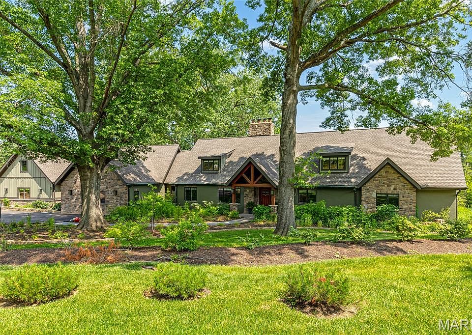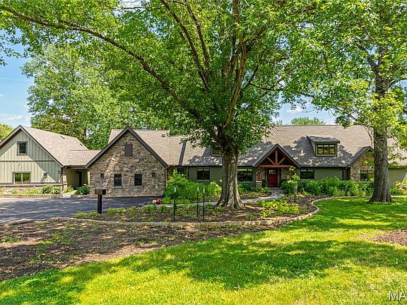 An impressive brick, stucco & cedar elevation defines the rustic architecture of this spectacular 7199 sf 1.5 Sty. Open floor plan features soaring ceilings, timber beams & oak hardwoods. Vaulted living room with stone accent wall with fireplace adjoins formal dining room & family room with expansive windows that offer sweeping views of the natural surroundings. Exceptionally large kitchen with glazed cabinetry, quartzite countertops, premium appliances, center island, butler’s pantry & fireplace opens to screened porch. 4 Additional bedrooms, 1 with ensuite bath & 2 with Jack n’ Jill bath, hall full bath, private study & bonus room complete the main floor living quarters. Oak staircase accesses primary bedroom suite with luxury bath with freestanding tub. Lower Level includes recreation room, 6th bedroom & full bath. Situated on a wooded 3-acre lot adjacent to Queeny Park with 2 patios & 4-car garage with carriage apartment plus an additional building with workshop & 2 horse stalls.