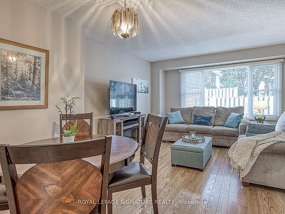 Welcome Home!This beautifully maintained 3-bedroom townhouse offers a perfect blend of comfort, style, and convenience. Featuring two renovated bathrooms, a spacious eat-in kitchen, and newer hardwood flooring in the living and dining rooms. Upstairs, you'll find generously sized bedrooms, while the finished basement provides extra living space for a family room, office, or gym. One of the standout features: you can park right in front of your home with no shared driveway, a rare advantage in this community.The complex includes a pool, community centre, and playground, making it ideal for families. Location is unbeatable: you are just steps to public transit, minutes to major highways, and surrounded by great schools and different parks. The Appleways is a close knit community where neighbours become friends and look out for each other. 5 Golden Appleway is one of the best locations in the complex. There is visitor parking as well. The complex is run smoothly by a respectable company and keeps the grounds looking well all seasons. Snow shovelling and grass cutting is included in the maintenance fee as is the Rogers package with internet and cable TV. There are many different grocery shops and restaurants. Tennis courts, an outdoor ice ring, parks and walking trails are also near by. This home truly has it all: space, updates, amenities, and a fantastic neighbourhood!