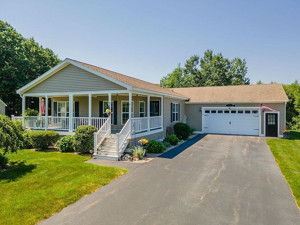 Welcome to Greystone Village, one of the seacoast's most desired 55 plus communities! Just minutes from the beach, shopping, golf courses and downtown Portsmouth. This open concept, one level home has been meticulously maintained by its original owner and sits on a prime corner lot. The covered farmers porch is a perfect place to sit with a morning cup of coffee. As you enter you are greeted by an upscale kitchen with stainless appliances, Maple cabinets and quartz countertops that opens up into a spacious dining and living room with crown molding throughout. The open space boasts oversized windows with lots of natural light and is perfect for entertaining family and friends. The den sits off the living room and is bonus flex space an office or craft room. The primary bedroom has a large walk-in closet and a private bath with an over sized step-in Shower. The guest room has ample space and a large closet with a full bath directly across the hall. The laundry area is located between the kitchen and entry way from the 2 car, fully insulated and heated garage with lots of room for storage. Other features included irrigation, full house stand by generator, Reeds Ferry Shed and a pet friendly community. Delayed showings start at the open house this Saturday 7/13 and Sunday 7/14 ,11am-1pm both days.