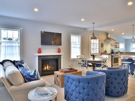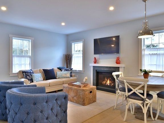 "Edge of Green" A stunning 3-bedroom, 2.5-bath home offering modern amenities and historic charm in Nantucket's Old Historic District. Renovated by White Hart Development with Nantucket Architecture Group, White Hart Interiors, and Trottier Woodworking, this home features an open-concept living area with gas fireplace and a custom kitchen with white and Stiffkey Blue cabinetry, slow-close drawers, and a handcrafted 6-foot butcher block island with pendant lighting. A coffee/beverage station and office nook add clever functionality. The main-level Sconset Suite includes a queen bed and spa-like bath with dual vanities and white tile shower. Upstairs, the Wauwinet Room offers a king bed and the Jetties Room twin beds, sharing a luxurious bath with quartz vanities and a Kohler shower. Outdoor spaces include two flagstone patios, a private yard, deck, outdoor shower, and shell driveway. Welcome to Edge of Green Nantucket living at its finest.