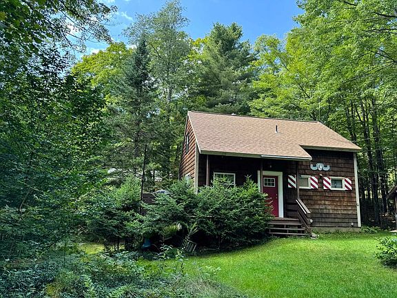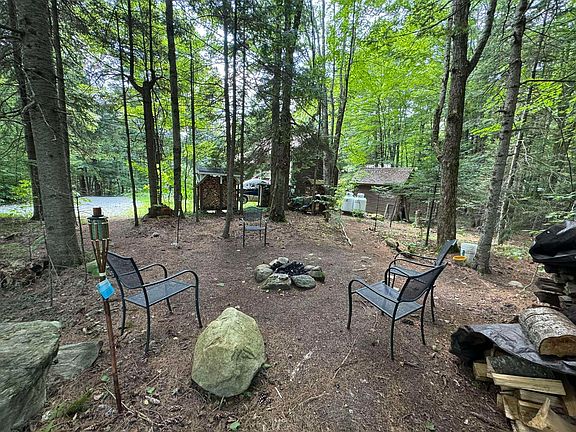 This charming chalet situated in Chimney Hill has undergone recent upgrades, including a newly installed circular driveway with ample parking. The property features a secluded outdoor fire pit area, perfect for leisure time with friends and family. Upon entry, a new front door leads to a mudroom designed to keep gear organized. The open dining and living room area extends to an outdoor wraparound deck with space for grilling and dining. The central living room is characterized by a large wraparound couch complemented by a unique German wood stove, ideal for activities such as puzzles, movies, and card games. The first floor encompasses a bedroom with a washer and dryer, a full hall bathroom, and a galley kitchen. The property retains its original hardwood flooring, with the kitchen and mudroom updated with new flooring. The second floor houses two bedrooms and a half bathroom. Additional upgrades include a new roof, as well as new living room and bedroom windows. The interior-accessed basement is dry and features new spray foam insulation, fireproof paint, and a new forced hot air heating system. While the basement's ceiling falls slightly short of full height, it serves as excellent storage space and is utilized as a ski tuning workshop. Chimney Hill amenities include a clubhouse with indoor/outdoor pool, gym, tennis and basketball courts, skating rink, VAST snowmobile trail access, and hiking trails. Close proximity to skiing, shopping, dining, and lakes.