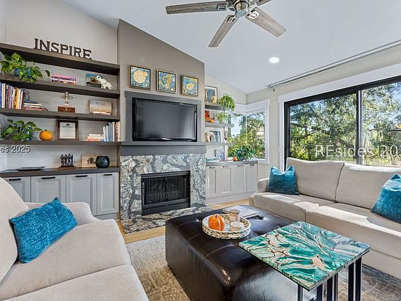 Welcome home to this stunning marsh-view retreat in the desirable Marsh Side community! This beautifully renovated 2-bedroom, 2-bath flat blends modern coastal style with easy island living. Every inch has been refreshed from the smooth cathedral ceilings to the new floor joists. The chefs kitchen shines with leather-finish quartz counters, custom cabinetry, and GE stainless steel appliances, including a new GE refrigerator (12/24). Additional upgrades include new HVAC systems (2023 & 2024), luxury vinyl plank flooring, electric fireplace with custom built-ins, designer lighting, and enhanced storage throughout. Convenient laundry with washer and dryer located near the primary suite featuring custom bath cabinetry. Step outside to enjoy your new back deck overlooking the serene marsh . Nestled at the quiet back of the complex for ultimate privacy. Marsh Side offers a resort-style pool, fitness room, and on-site laundry. Ideally located near Cross Island Parkway, 278, schools, shopping, and Hilton Head Hospital. Truly move-in ready perfect for year-round living or a lock-and-leave island getaway!