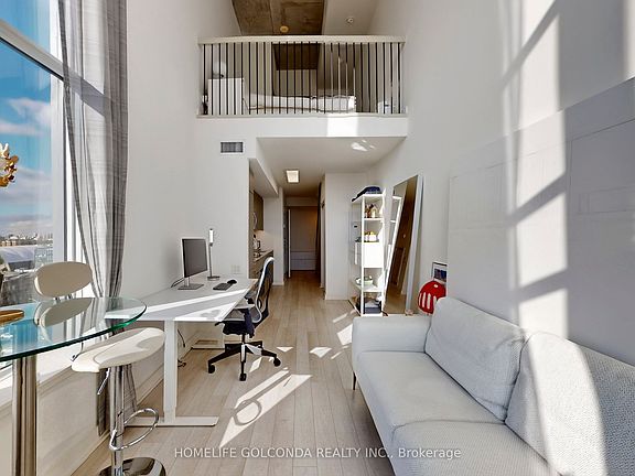Welcome To This Outstanding Southwest-Facing Corner Loft In The Heart Of Liberty Village. This Bright And Spacious Unit Features Soaring 19-Ft Ceilings, Two Floor-To-Ceiling Windows, And Beautiful Lake And City Views. Offering 715 Sq. Ft., Two Bathrooms, And An Open-Concept Living/Dining Area, This Loft Blends Style, Comfort, And Convenience. Unbeatable Transit Access: Steps To The GO Exhibition Station, King Streetcar, And Multiple Bus Routes. Easy Access To The Gardiner And The Future Ontario Line Subway Station, Making Commuting Across The City Effortless. Minutes to 24-hr GoodLife, Metro, Organic Garage, Shoppers Drug Mart, Restaurants, Trendy Cafes, And Boutiques.