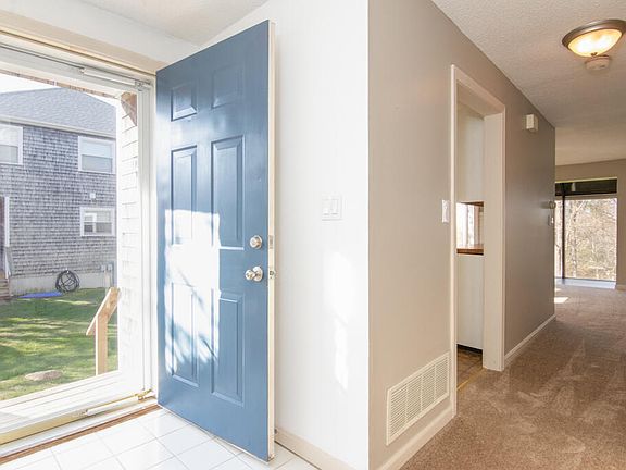 The Flagship property of Harbor Hill, #5 has it all. The privacy of a townhome style end-unit with side entrance, full sun & flooded with natural light. 3 floors of spacious living, natural gas heat, central ac, & many updates throughout. First floor features tile entry, updated galley kitchen w/ subway tile backsplash, butcher block counters w/ white cabinetry. Open concept dining area & living room with newer wall to wall carpets, fireplace, & slider out to deck. Bathroom incl shower completes the main level. The second level offers two generous sized bedrooms with plenty of closet space, newer carpets, & full bath. Bonus space in beautifully finished lower level that features an oversized family/game room, office area, work room, laundry nook, wall to wall carpet, electric fireplace, recess lighting, & loads of storage. Abutting Brookside Golf course and minutes to the Bridge, nearby beaches, & Cape Cod Canal. Approx one hour to Boston&Providence w/easy on/off access. Come see. Wow!
