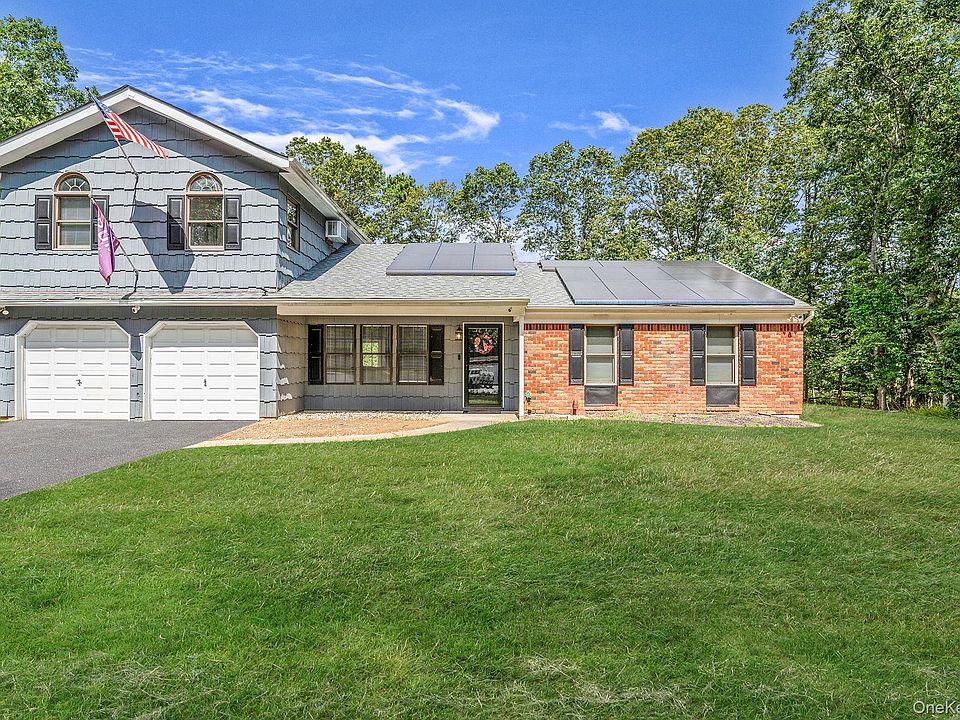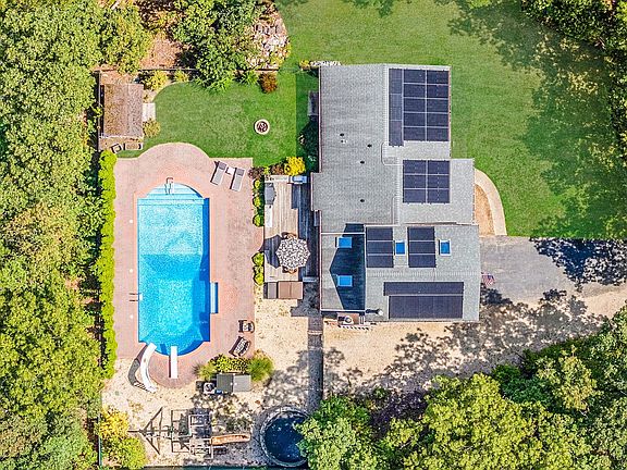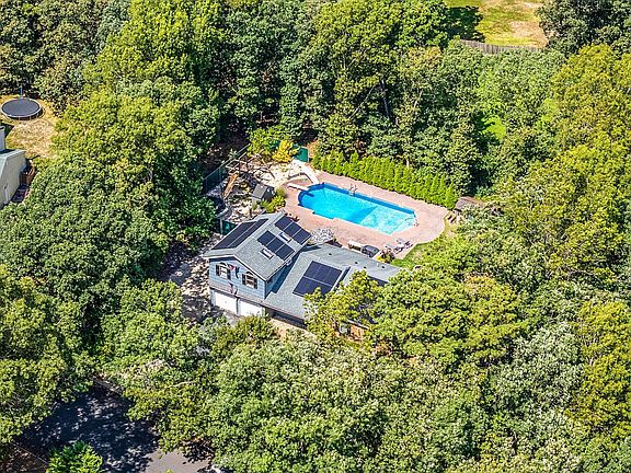 Welcome to 5 Hastings Drive in Ridge – a beautifully updated expanded ranch offering 2,000 sq. ft. of light-filled living space on an oversized .73-acre lot in a serene, tree-lined neighborhood! With the backyard of your dreams and tons of upgrades, this home is the one you won't want to miss! Step inside to find a spacious living room with crown molding, recessed lighting, and new laminate flooring. The fully renovated eat-in kitchen is the heart of the home, featuring white shaker cabinets, stainless steel appliances (including a Samsung AI fridge), electric cooktop, center island, and an open flow to the formal dining room with vaulted ceilings and a cozy wood-burning fireplace – perfect for entertaining. The main floor includes a primary en-suite bedroom with full bath, plus two additional bedrooms and another updated full bath. Upstairs, you’ll discover an oversized den with vaulted ceilings, a fourth bedroom ideal for extended family or guests, and a huge attic that offers incredible storage or the potential to be finished into more living space. The backyard is a true retreat – totally private and designed for fun and relaxation. Enjoy the in-ground saltwater pool with diving board and slide, beautiful pavers, high-efficiency heater, Loop-Loc cover, and a young liner, pump, and filter. This home also features a 2-car garage, new windows and sliders, 4-year-young central air (downstairs) & 2 year young ductless upstairs, 200-amp electrical panel, a generator switch, a new heat pump & hot water heater (2022), young roof (2017), and financed solar panels for energy savings! Move-in ready with modern upgrades and a dream backyard, this home truly has it all!