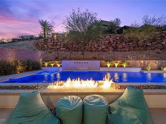 Discover elevated resort-style living in this fully furnished modern masterpiece, ideally situated on a private corner lot at the end of a cul-de-sac in Lake Las Vegas. Built to entertain, the home showcases an 800 sq. ft. saltwater pool with waterfall, glass fireplace, and sunken TV lounge. Massive pocket sliders in both the great room and downstairs primary suite open to seamless indoor-outdoor living. A show-stopping gourmet kitchen is paired with a full catering/prep kitchen featuring premium appliances. Take in panoramic lake, mountain, and resort views from the rooftop deck with refrigerated island and bar seating. The flexible floorplan includes a loft with pivot door, exercise room, and multiple fireplaces throughout. With too many upgrades to list and a Lake Las Vegas Sports Club membership included, this home is an exceptional opportunity for luxury desert living.
