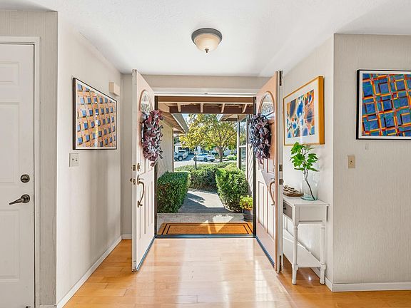 Welcome to 5 Justin Court, nestled in an enclave of 6 contemporary homes amongst Northwest Napa's desirable Redwood Village neighborhood. This single level home with great curb appeal and a double door front entry that leads to a lovely space featuring wood floors throughout, plantation shutters, vaulted ceiling, stone fireplace, open kitchen, wet bar, remodeled guest bath, and multiple glass doors that open to an ultra private backyard and veggie garden with raised beds. The artist, craftsman, or work from home professional will love the detached and spacious workshop/art studio. This dynamic property has a lot to offer at an affordable price.