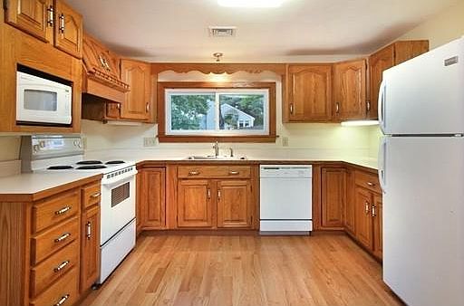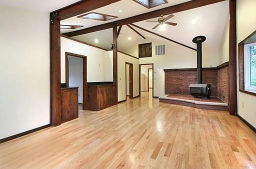 Impressive space greets you as you enter a large front to back living area w/cathedral ceilings, skylights, and wood beams. Natural light fills and warms the room. The perfect space to entertain. The brick hearth/wood stove fills the room with warmth, enjoy a quiet evening at home in front of the fire. With a very stylish single level design you'll be surprised by the space. 2 bdrms sit off the main liv area. Vast space along the back of the home creates a 3rd bdrm/playrm/or office. There are 2 bonus rooms for storage/laundry/utilities. You can complete your visions for a gorgeous new kitchen in this spacious footprint and revitalize w/a remodel. All the expensive updates have been done for you (siding, windows, roof, heating, central air, electrical, plumbing, septic, and hardwood floors throughout) leaving you with more money to do the fun stuff (like a kitchen). Make the space yours. Outside build a beautiful oasis with a gorgeous .37 acre lot or add-on to expand your new space