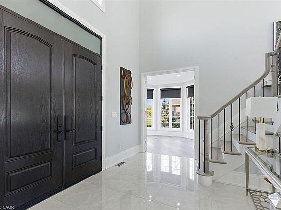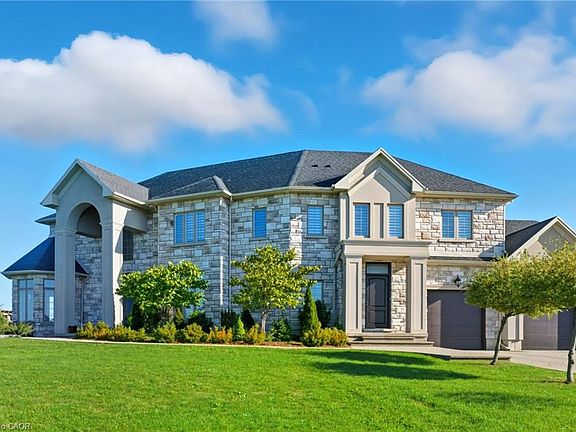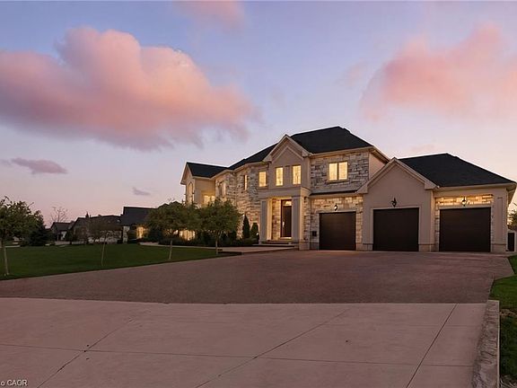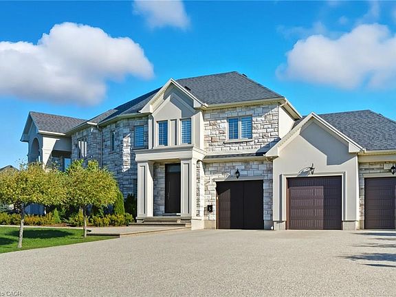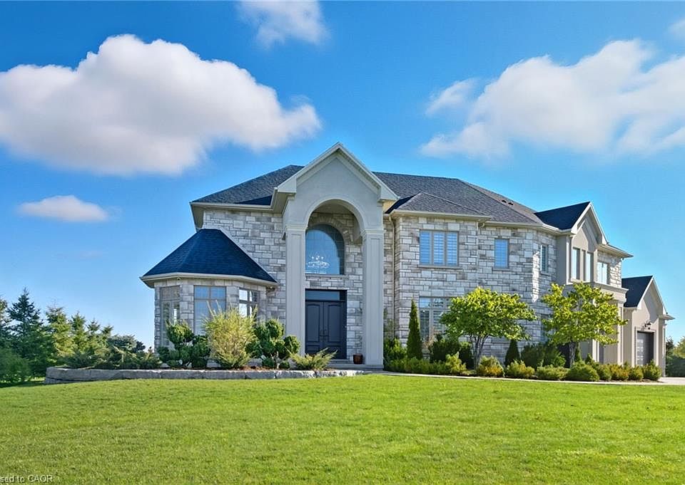 Introducing 5 Kramer Court, an exceptional custom-built home in Empire Country Estates offering over 5,000 sq.ft. of meticulously finished living space on a pristine 1.19-acre lot. The grand double-height foyer, crowned by Palladian windows, immediately impresses, complemented by soaring 10’ and 18’ ceilings on the main level, 9’ ceilings throughout the upper and lower floors, 8’ interior doors, exquisite chandeliers, custom wainscoting, and detailed crown moulding. The open-concept main floor is anchored by a chef’s kitchen of remarkable scale, featuring full-height custom cabinetry, quartz counters and backsplash, a generous center island, built-in professional-grade appliances, and a walk-in pantry. Adjacent, the great room captivates with a 20’ coffered ceiling, full-height windows framing serene garden views, and a commanding gas fireplace with custom built-ins. A formal dining room, private office, and secondary entry with mudroom complete the principal level. Upstairs, the elegant primary suite offers an expansive walk-in closet, spa-inspired 5-piece ensuite with dual vanities, and a private 15’x17’ sundeck overlooking the landscaped grounds. Three additional bedrooms, a 5-piece bathroom, and a thoughtfully designed laundry room with built-in storage complete the upper level. The fully finished lower level presents a sprawling open recreation area, dedicated gym and den spaces, a large bedroom, 3-piece bath, ample storage, and walk-up access to the triple garage. Outdoors, multiple terraces provide elegant seating and dining areas, complemented by a cozy firepit, professionally landscaped gardens, fruit trees, and a 20’x15’ insulated garden shed, creating a seamless blend of luxury, functionality, and refined estate living.