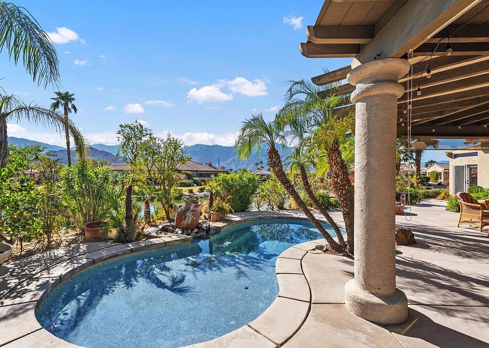 Welcome to 5 Lake Louise Ct -- a captivating desert retreat nestled in the sought-after lakefront community of Mission Shores. This remarkable 4-bedroom, 4-bathroom residence sits on a premier lot offering panoramic views of the surrounding mountains and shimmering lake, creating a truly breathtaking backdrop for everyday living.Step through the private entry courtyard and discover the inviting detached casita, perfect for guests, complete with its own en-suite bath. As you enter the main home, you'll be drawn in by the bright, open-concept layout filled with natural light and a seamless indoor-outdoor flow.The chef's kitchen is the heart of the home, featuring a large granite island, extensive cabinetry, and a spacious walk-in pantry -- ideal for both everyday living and entertaining. Recent upgrades include a fully owned 21-panel solar system and newer HVAC systems, offering energy efficiency and peace of mind.The primary suite is a tranquil sanctuary, where you can unwind while soaking in the lake and mountain views. The en-suite bathroom offers dual vanities, and two walk-in closets.Step outside to your private backyard paradise -- enjoy a dip in the sparkling pool, savor the views from your sun-drenched patio, or escape to the enclosed sunroom equipped with a mini-split system for year-round comfort.Mission Shores is a picturesque gated community known for its lush greenbelts, and scenic lakes. Ideally located near top-tier dining, shopping, and golf -- this is the ultimate desert lifestyle.Don't miss your chance to make this rare lakeside gem your own oasis in the desert.
