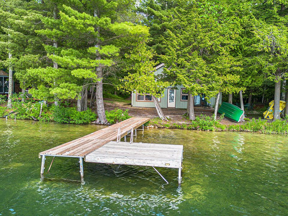 Welcome to your private retreat on beautiful Bass Lake! This charming, move-in ready cottage is being sold fully furnished; just bring your swimsuit! From kayaks & paddle boats to grills, firewood, & cozy furnishings, everything you need is already here. Inside you'll love the perfect blend of rustic charm & modern comfort. The home features 2 bedrooms, full bath, convenient laundry area, & a warm, inviting kitchen. The loft offers potential for additional sleeping space, & the living and dining areas showcase breathtaking panoramic lake views. Step outside to a spacious deck, ideal for stargazing & sunset dinners. Enjoy swimming, fishing, or sunbathing from your private dock. Two large storage sheds keep all your outdoor gear organized and tons of parking for all your guests.