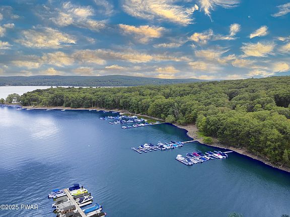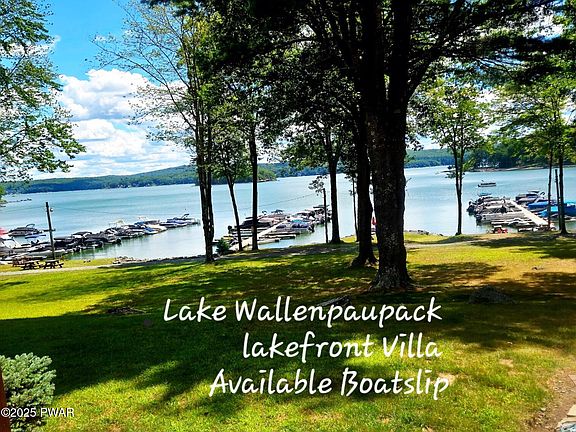 Enjoy magnificent views of LAKE WALLENPAUPACK from your lakefront villa located in COVE POINT CLUB. Step inside the foyer that has a powder room and find three levels of living. The main floor has an open floor plan with skylights in the vaulted ceiling, livingroom and dining area, kitchen with granite countertops, farmhouse sink and breakfast bar. This floor has a wood burning fireplace in the center and 2 sets of sliders out to a deck as long as the unit to entertain, barbecue or relax with a fantastic lake view. Upstairs find 2 good size guest rooms and a full bath. Head down to the lower level where the family room has a fireplace and sliders to another deck length of the unit. Primary suite is also on this level with bathroom that features whirlpool tub and shower plus the bedroom with sliders to the lower deck and steps out to the lake and community boat dock. This villa is ready and waiting for new owners to start experiencing lake life! Wallenpaupack Area School District See you in The Poconos!