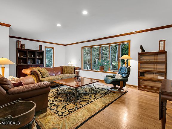 Beautiful Ranch style home with a basement set in a quiet neighborhood on a cul-de-sac. Open and airy interior with oversized windows, hardwood flooring and decorative millwork throughout. Eat-in kitchen with granite countertops open to an inviting den with wood-burning fireplace and easy access to a screened-in porch overlooking private yard. Expansive family room, formal dining room, large primary bedroom with walk-in closet and en-suite bathroom plus two additional bedrooms each with generously sized closets and hardwood flooring. Basement with comfortable ceiling height offers ample storage and is perfect for finishing! NEWER ROOF (2018) AND HVAC (2019). Two-car direct entry garage, usable and level rear yard with wonderful privacy, charming gazebo and paver patio. Minutes to NJT.