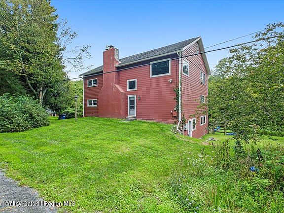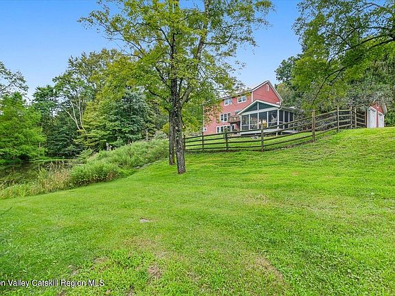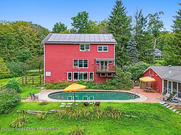 Historic character with loft-like drama: This converted barn on a quiet country road in Clinton Corners was originally built in 1869 but has been transformed into a residence that masterfully blends rustic charm with visual delights, inside and out. Nestled on a gently sloped 1.79-acre parcel with views of a pool area and adjacent pond, the house features soaring cathedral ceilings and original beams throughout all three levels of living, plus hardwood floors, a grand living room centered on a soaring stone fireplace, an eat-in chef's kitchen complete with a butler's pantry and bar, and an oversized dining room. A den/study with a convenient half bath completes the main level, offering a quiet space for work or relaxation. Upstairs are three unique bedrooms, each with its own private bathroom and arranged around a dramatic open staircase and catwalk designed to highlight the antique beams and joists of the building. The expansive walk-out lower-level family room is perfect for gatherings, with a secondary kitchen that opens directly to the pool area and outdoor shower. The property's four-season stream and tranquil pond are visible from most rooms and there's also a large screened porch perfect for watching the birds and other wildlife that gather at the water. Behind the porch is a large 2-car garage plus a separate small barn perfect for storage or creative projects. Coupled with the forested surroundings, the property offers an idyllic and quiet slice of country life just 2 hours by car from NYC and minutes from the villages of Rhinebeck and Red Hook.
