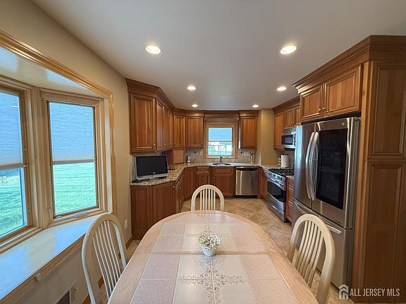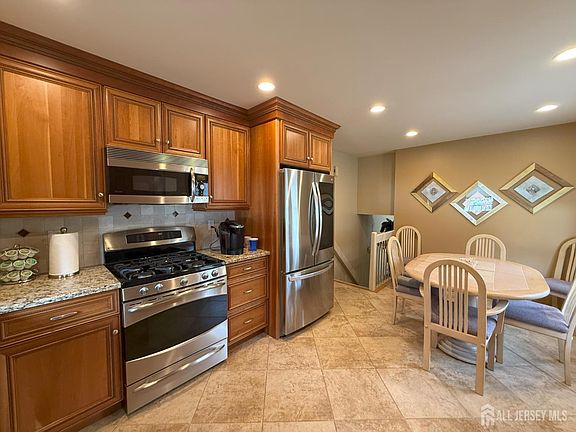 Move right in to this beautifully updated 4 Bedroom, 2.5 Bath split-level home in the prestigious Apple Tree section of East Brunswick. Perfectly situated at the head of a quiet cul-de-sac, this residence offers over 2,100 sq ft of living space on a .38 acre lot with stunning mature landscaping and an expansive 800+ sq ft patio overlooking a private, park-like backyard ideal for entertaining or relaxing. Inside, the home boasts a fully renovated eat-in kitchen with custom cabinetry, granite countertops, tile backsplash, and stainless steel appliances. The bright dining room, spacious living room, and inviting family room feature Pella windows and doors, filling the spaces with natural light. All three bathrooms have been tastefully renovated, and new doors, custom window treatments, recessed lighting, and elegant finishes add to the home's modern appeal. A half basement with laundry and walk-in closet provides excellent storage. Additional highlights include a 2-car garage, newer siding (2018), roof (2020), central AC (2020), sprinkler system, and fire/security alarm system. With East Brunswick's top-rated schools within walking distance and convenient access to NYC bus service, this home combines comfort, style, and location.
