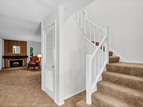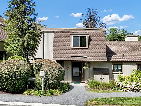 This desirable unit has been in the same family since its construction. Sought after private location overlooking the fairway from the patio with soothing fountain. Freshly painted throughout. Welcoming foyer with guest closet. Remodeled kitchen with custom cherry cabinetry, maintenance free engineered wood style flooring, plenty of Corian counters, virtually new stainless appliances, one of a kind tile backsplash, under cabinet lighting & generous eating area.L-shaped living/ dining with new sliders accessing private patio with awning.Fireplace has electric insert that can be easily removed and converted to wood burning.Book & display shelving abound. Neutral carpeting throughout both floors. 1/2 bath has newer fixtures, vanity, granite counter & tile floor. Top of the stairs has new dryer with good storage and washer. Primary bedroom with sitting area and spacious closet also has its own balcony all overlooking the golf fairway. Full remodeled bathroom connects with additional closet, newer vanity & tile floor. An additional vanity with sink connects from the other bedroom. Jack & Jill style.Other bedroom is filled with natural light, has built in shelving and a walk in closet. Electric baseboard heat throughout. Central air unit replaced couple of years ago. All light fixtures are newer. Garage unit is #5 and is around the corner. An exceptionally comfortable unit in an outstanding location. Windows replaced with low E throughout.