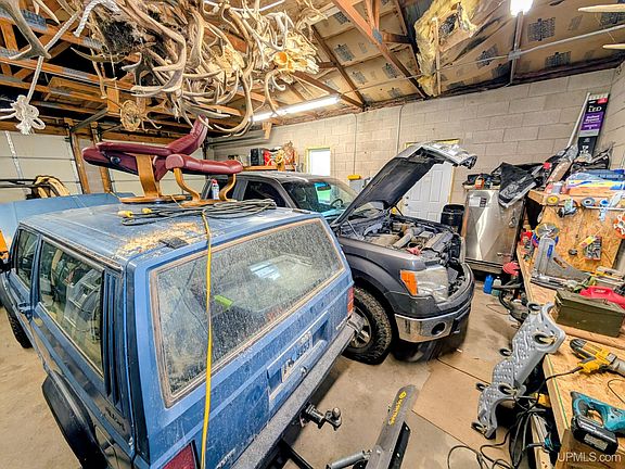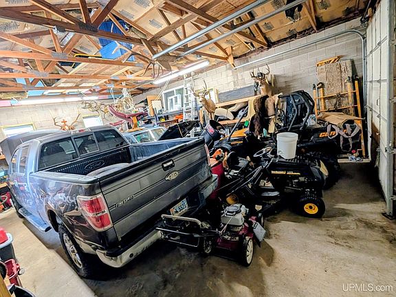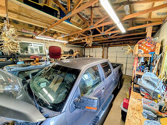 Check out this 24'x32' cinder block, insulated, metal roofed garage with cement floor, 220 amp wiring with outlet for welding unit for the garage mechanic/ metalworker. Features large 10 foot overhead doors and 12 foot ceiling. With its poured 4 foot footings you could build onto this! No cracks in the floor or walls. Currently heated with a wood stove. This place works whether you're looking for extra storage for your stuff, a workshop or a place to build your house/camp that already has the garage. City water and sewer are available to hook up.